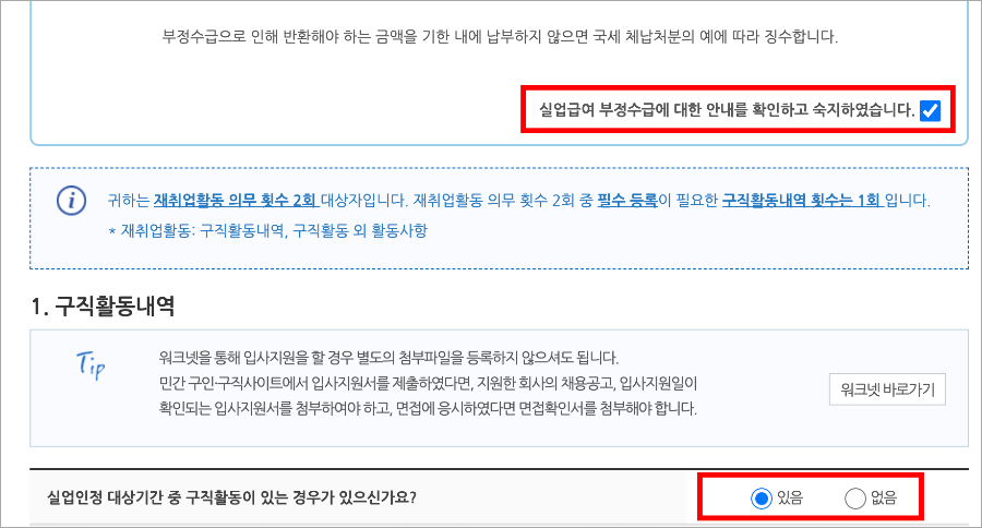 그리고 실업인정 대상기간 중 구직활동이 있는 경우가 있으신가요? 에 있음 버튼을 눌러주세요.