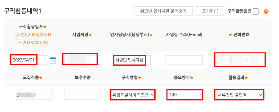 3. 사람인에서 구직활동 내역서를 받으셨다면 어렵지 않게 작성할 수 있습니다. 보고 * 가 있는 부분은 모두 적어주세요. 그 외의 부분은 생략하셔도 좋습니다. 사람인 인사담당자(담당부서) 부분은 사람인 입사지원이라고 적어주세요.