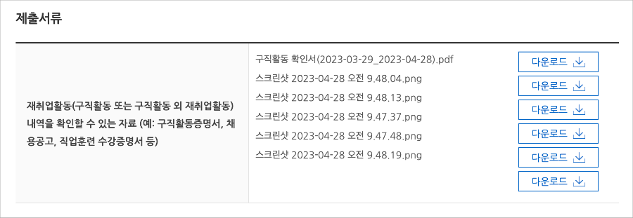 4. 다음 항목에 제출서류를 모두 첨부해 주세요. 다운로드하였던 구직활동 확인서와 캡처해 두었던 지원자격에 관항 필요한 정보들을 모두 첨부합니다.
