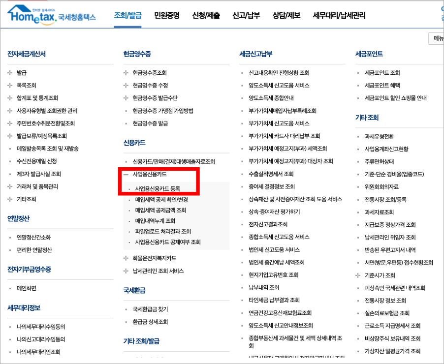[조회/발급]-[신용카드]-[사업용신용카드 등록] 에서 등록 할 수 있습니다.