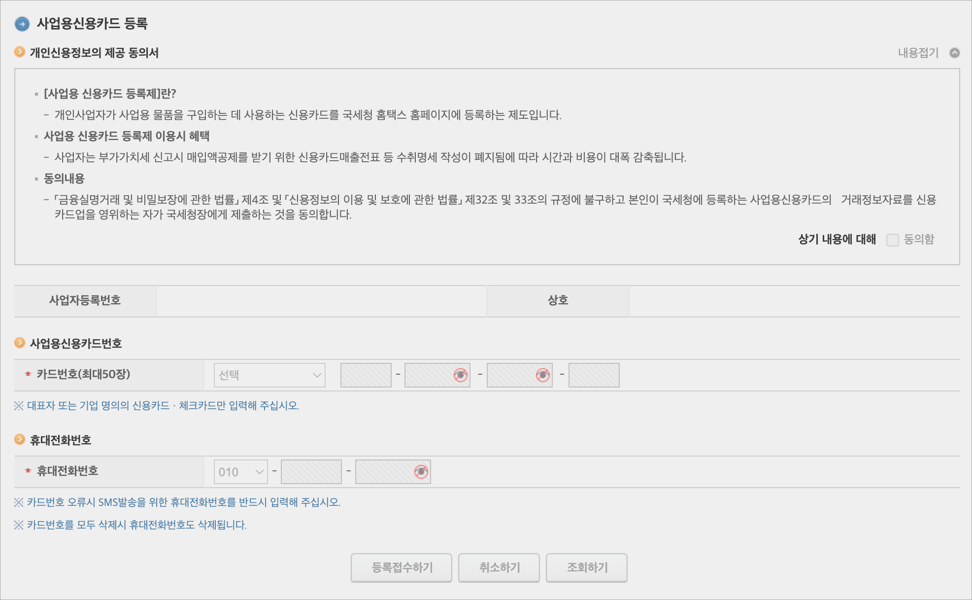 사업용 신용카드로 사용 할 카드번호와 휴대전화번호 등 개인정보를 입력하여 등록접수해주세요. 카드는 최대 50개까지 등록 가능하며 사업자 본인 명의의 카드만 등록이 가능합니다. 법인사업자의 경우 법인명의로 발급받은 신용카드라면 따로 등록하지 않습니다.