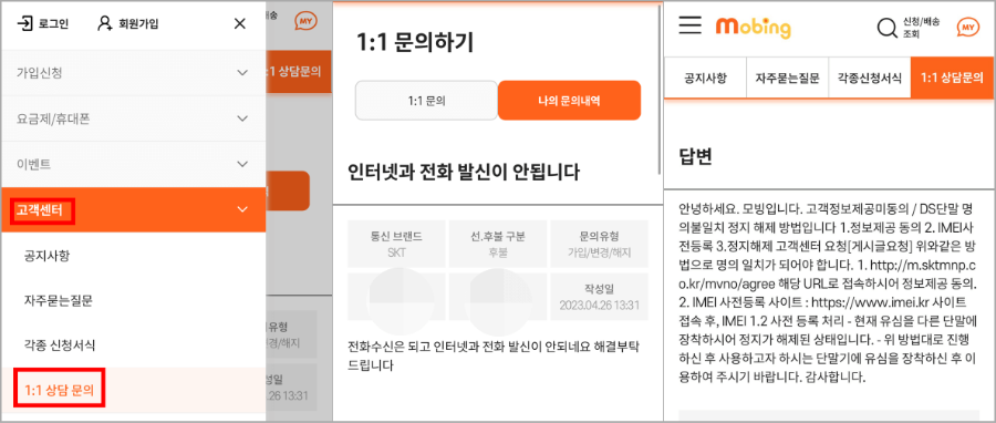 그래도 해결이 되지 않으면 고객센터(114)로 연락하셔야 하지만, 대부분 알뜰폰 상담원은 통화가 되지 않으니 해당 홈페이지에 들어가 1:1 문의로 해당 문제를 작성해 주시면 됩니다. 전화는 한 시간 내도록 걸어도 받지 않더니.. 문의는 20분 만에 답변이 달리더라고요..^^;