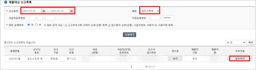 3. 제출대상 신고목록에 내가 양도세 신고한 날의 일자를 선택하여 조회하면 신고했던 신고서 목록이 나옵니다.