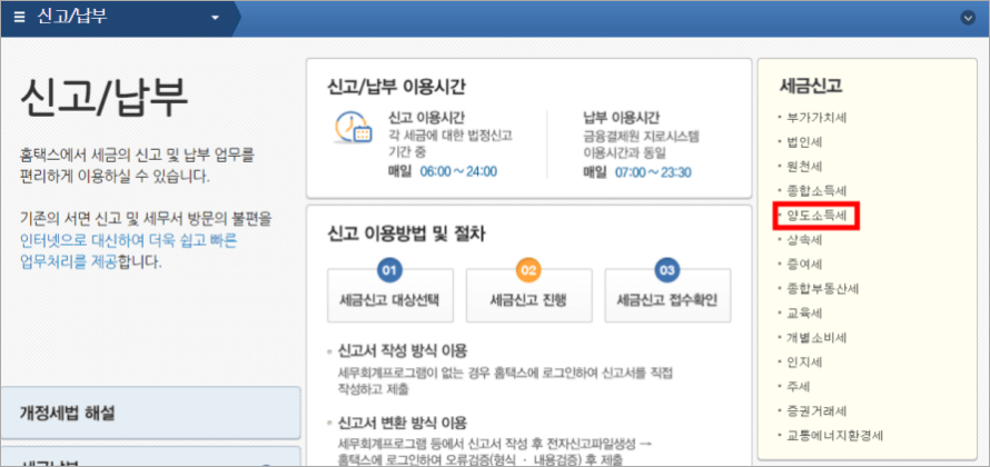 1. 국세청 (https://hometax.go.kr) 홈페이지에서 [신고/납부]-[양도소득세] 를 선택합니다