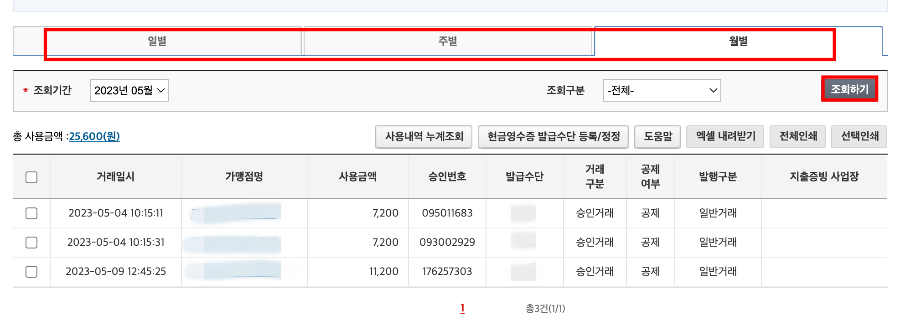 일별 / 주별 / 월별로 조회가 가능합니다. 조회기간을 선택하신 후 조회하기 버튼을 누르면 내가 발급요청한 현금영수증 신청이 잘 되었는지 확인하실 수 있습니다. 현금영수증은 발급신청 이후 국세청에서 확인을 한 다음에 발급이 되기 때문에 1~2일 정도의 시간이 소요될 수 있습니다.