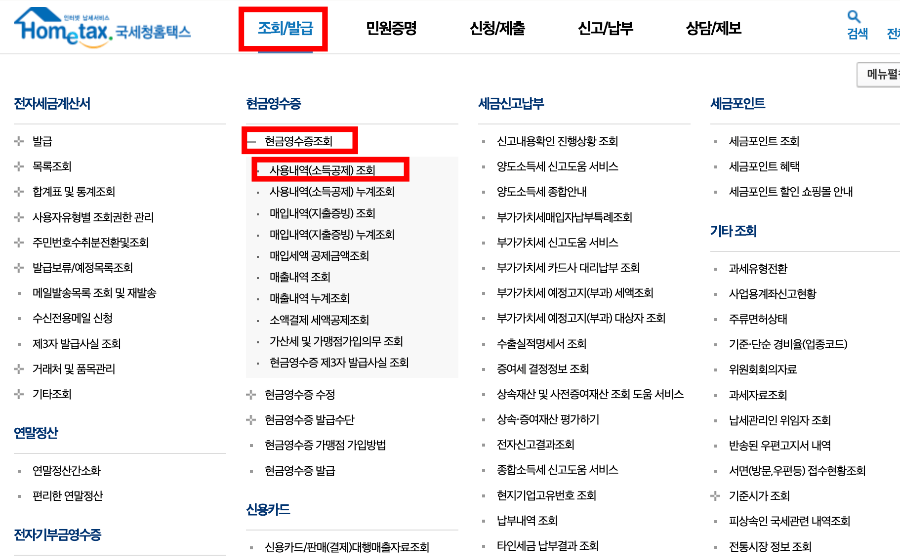 내가 요청한 현금영수증은 홈텍스 홈페이지에서 조회가 가능합니다.
